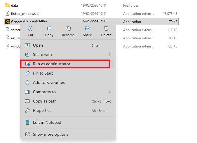 Si la désinstallation ne peut pas être effectuée (ou dans le cas d'une réinstallation propre de GENOME, ce dernier crashe au lancement), fermez l’utilitaire, puis cliquez avec le bouton droit sur l’exécutable et sélectionnez Exécuter en tant qu’administrateur (encadré en rouge dans l'image ci-dessous).
